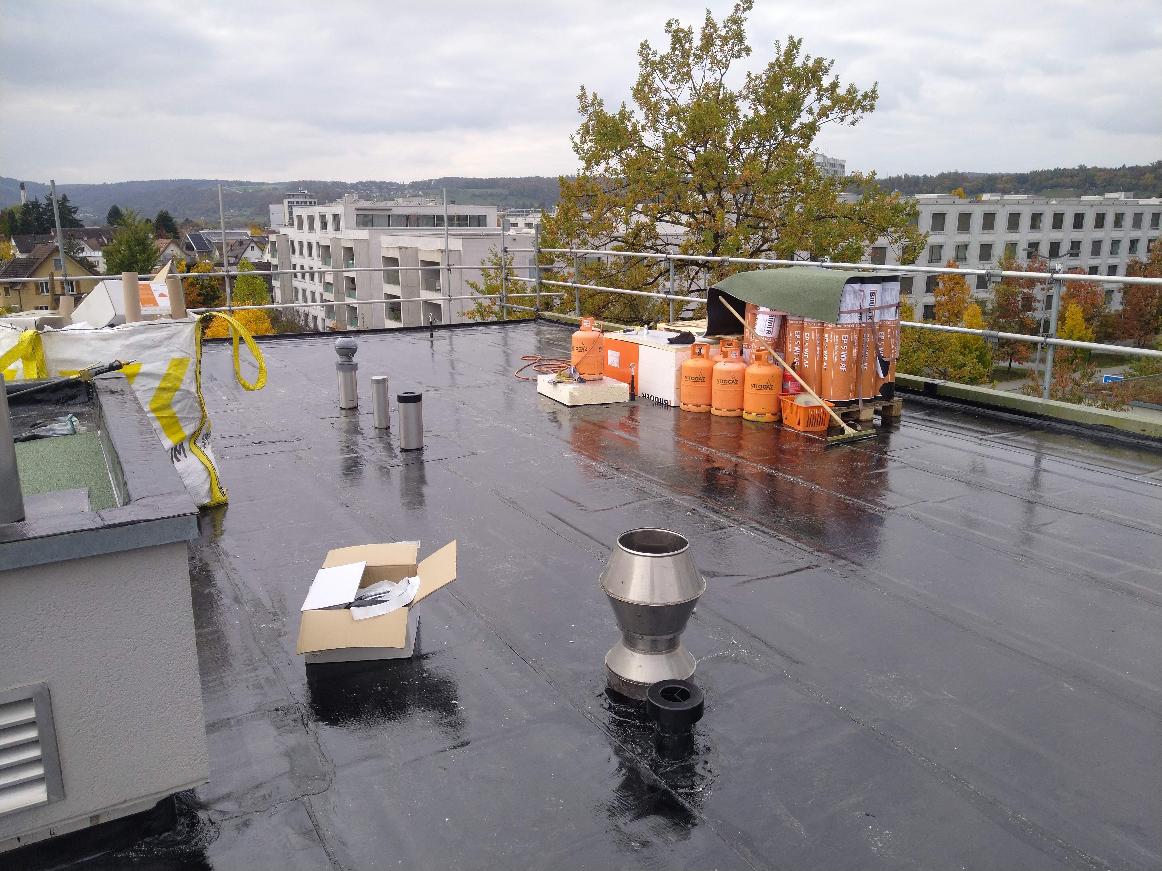 Das Sanierungsprojekt der STWEG Dohlenzelgstrasse 8 in Windisch startete mit einer Analyse der Ist-Situation im Rahmen einer GEAK-Plus Beratung. Damit wurde der energetische Zustand des Gebäudes bewertet sowie Optimierungspotenziale aufgezeigt. Im Rahmen der GEAK Beratung wurde festgestellt, dass das Flachdach undicht und die Dämmschicht dadurch komplett durchnässt ist. Um Folgeschäden durch den Wasserstau zu verhindern und die Dämmeigenschaft des Flachdachs zu verbessern, hat die WNC im Herbst 2025 innerhalb von 3 Monaten eine komplettsanierung des Flachdachs geplant und als Bauleiterin koordiniert und realisiert. In einem zweiten Schritt wird in der ersten hälfte des 2026 eine Photovoltaik Anlage (inkl. ZEV) auf das neu sanierte Flachdach installiert. Die WNC übernimmt dabei wiederum die Planung, Bauleitung und Qualitätssicherung für die Bauherrschaft.